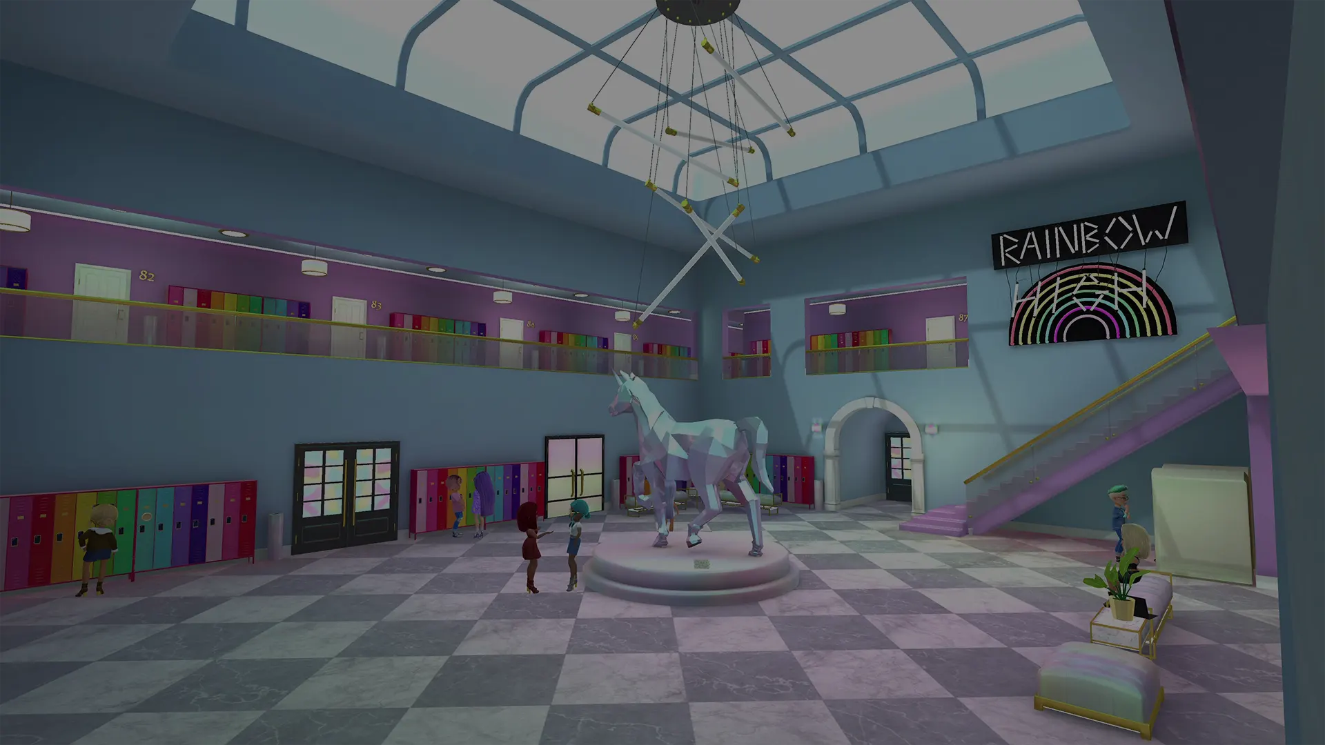 Take a tour around the school. Check out the Atrium, hang out in Sunny's bedroom and Rainbow Union, play games, take selfies in the Student Lounge, and find fun materials in the Fabric Studio.