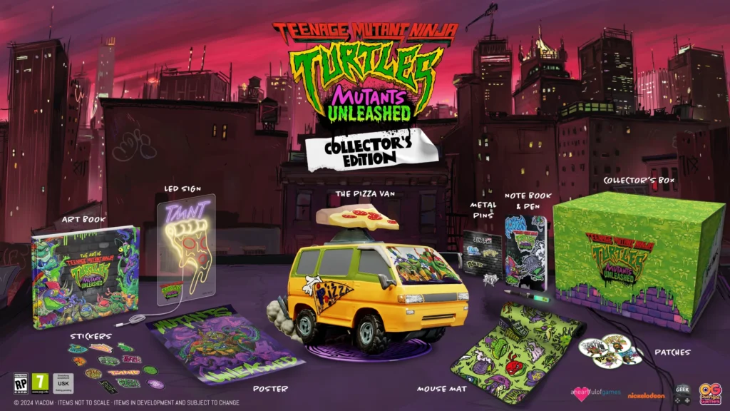 Paying homage to the iconic heroes in a half shell, fans will be able to get their hands on a radical artbook and an assortment of pin badges in both variants, with the Deluxe Edition also including 4 themed keychains and a unique Steelbook cover. The Collector’s Edition arrives jam-packed with access to the season pass for more post-launch awesome content as well as exclusive collectibles, including an iconic pizza van statue, gnarly LED pizza sign and more, all inside an incredible Collector’s Box!